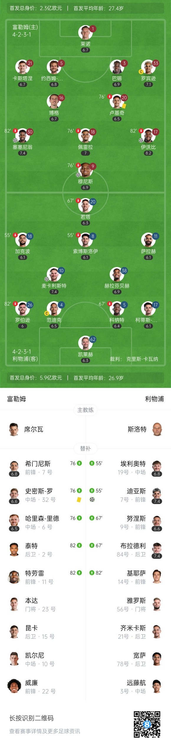 第31分钟,富勒姆反超比分!罗伯逊后场横传失误被断,随后伊沃比禁区左路抽射破门,富勒姆2-1利物浦。↓