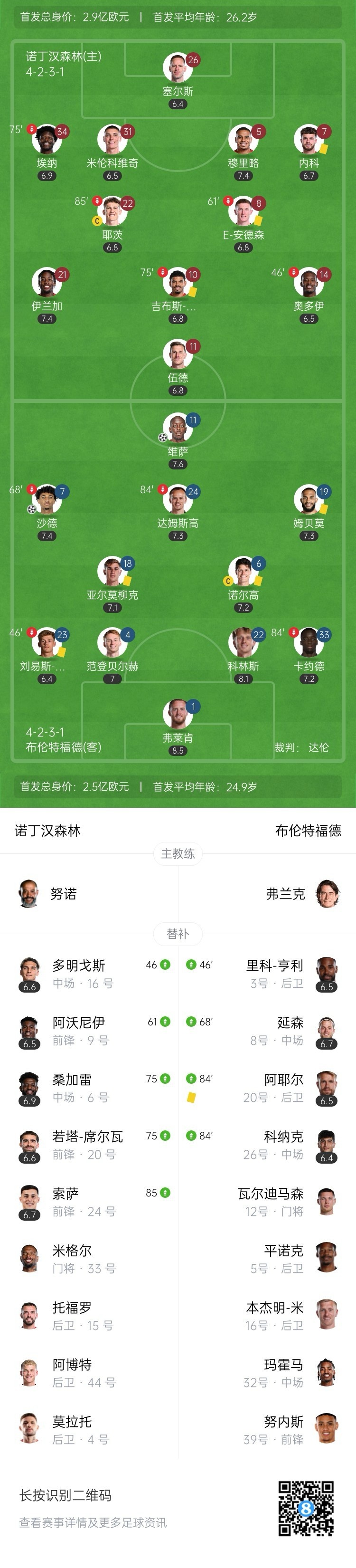 森林主场2球落后!第71分钟,门将弗莱肯大脚开球,森林后卫判断落点失误,维萨获得单刀轻松挑射破门,诺丁汉森林0-2布伦特福德!↓