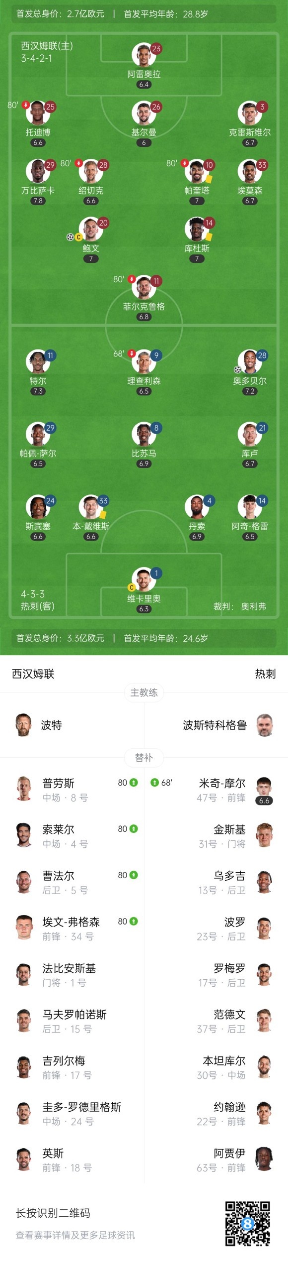 最终,西汉姆1-1热刺。