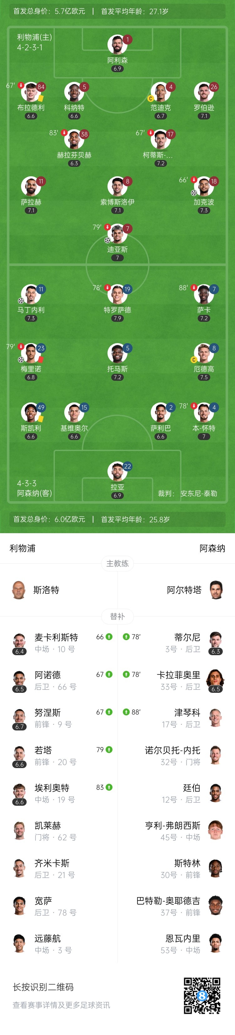 第20分钟,利物浦左路边线球掷出,罗伯逊得球送出传中,前点加克波头球攻门得手,利物浦1-0阿森纳。↓