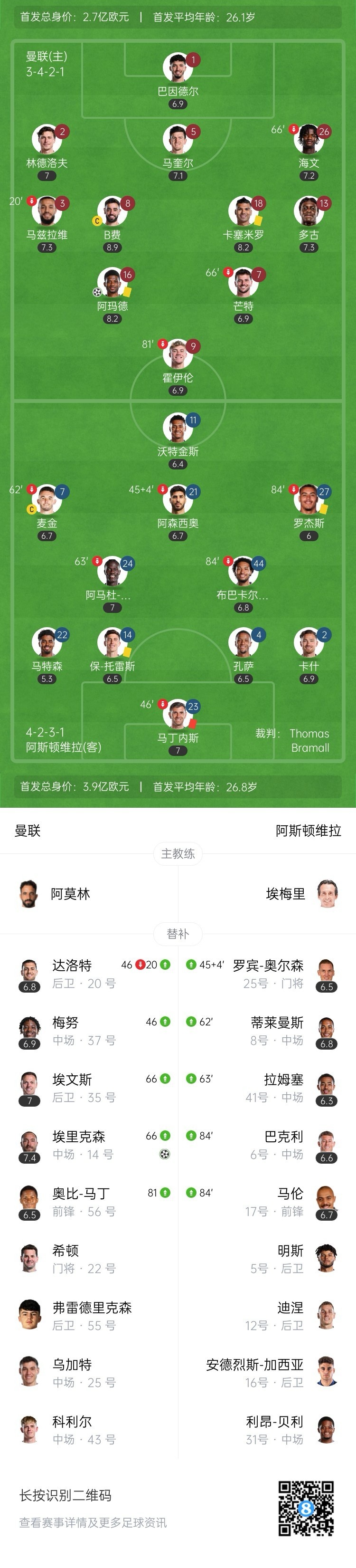 B费助攻,阿玛德破门!红魔领先!第76分钟,B费送出精准过顶长传,阿玛德插上头球攻门得分,曼联1-0阿斯顿维拉!↓