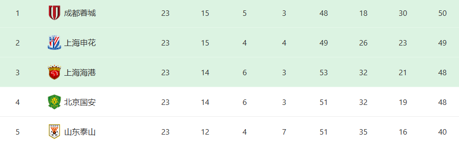 在上一轮4:1大胜卫冕冠军上海海港之后,成都蓉城一举反超争冠最大热门上海申花,抢占了中超榜首之位。不过,他们23轮过后,15胜5平3负,积50分,仅仅比上海申花多1个积分,比第三名上海海港和第四名北京国安,也不过多2个积分,争冠优势非常微弱。中超还剩最后7轮比赛,成都蓉城不能有半点闪失,否则,随时要拱手让出榜首之位。