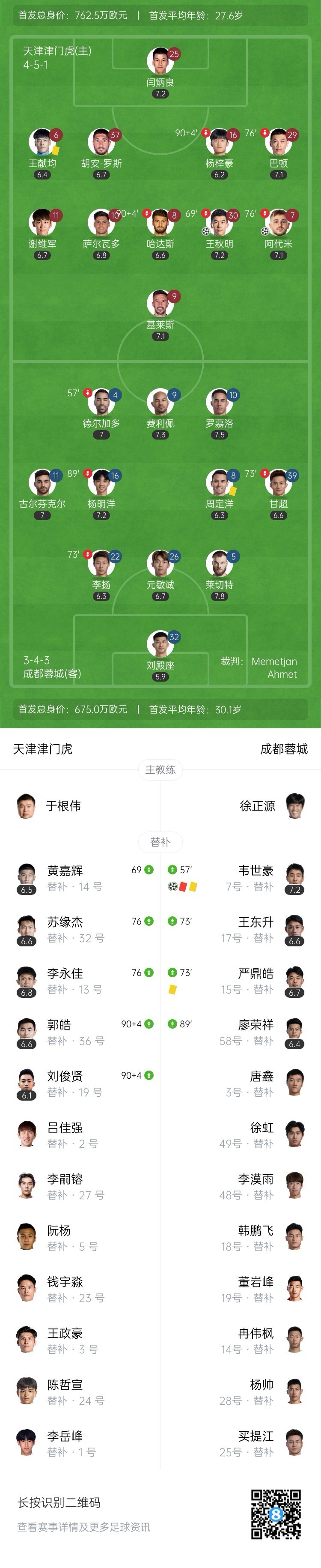第53分钟,津门虎取得领先,莱切特后场传给刘殿座,刘殿座出球失误,王秋明抢断后过掉元敏诚,面对刘殿座冷静打门得手,津门虎1-0领先蓉城。↓