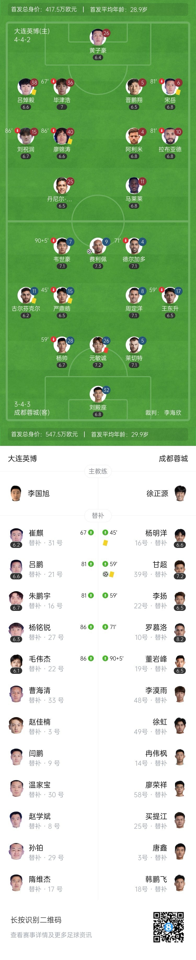 全场比赛结束,成都蓉城客场2-0战胜大连英博。