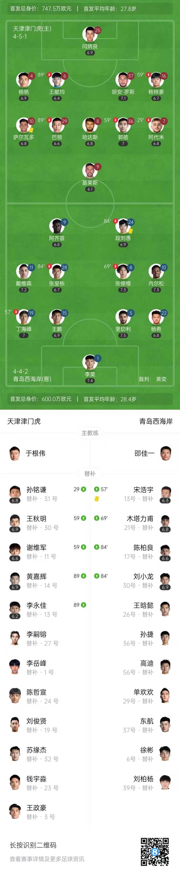 全场比赛结束,天津津门虎0-0青岛西海岸。