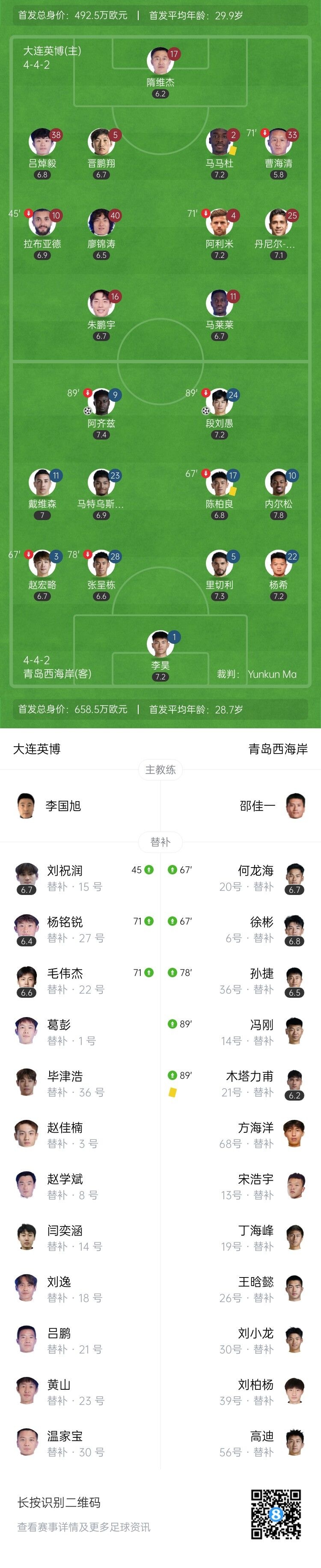 伤停补时10分钟。全场比赛结束,大连英博0-2青岛西海岸。