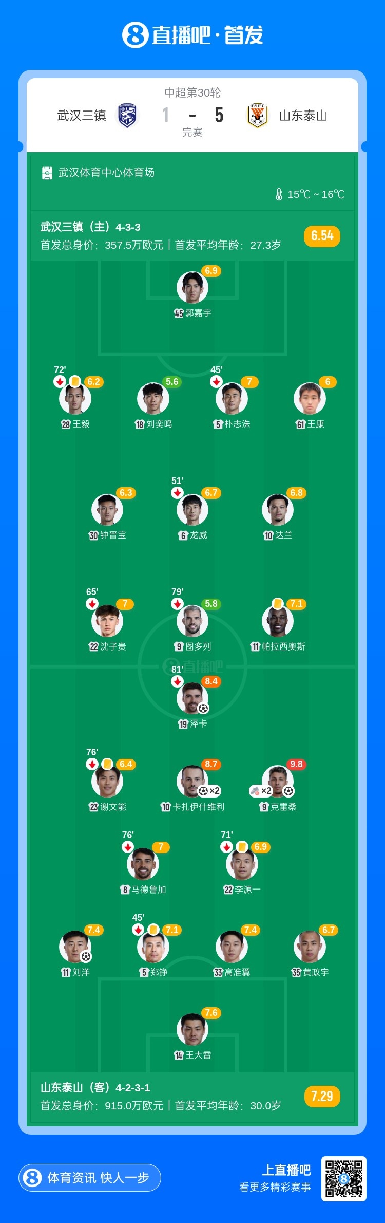 11月22日讯 北京时间15:30,中超第30轮武汉三镇vs山东泰山,比赛在武汉体育中心体育场打响!上半场,达兰头球补射因越位被判无效;随后图多列、卡扎伊什维利先后进球被吹!卡扎中柱;泽卡抽射破门帮助泰山取得领先!半场补时阶段,刘洋包抄破门!下半场,泽卡造点,卡扎伊什维利点射破门!汪晋贤造点,图多列主罚点球被王大雷扑出!卡扎伊什维利低射完成双响!克雷桑尾声阶段再下一城。最终,山东泰山5-1击败武汉三镇,泰山中超第5收官,三镇排名第13。