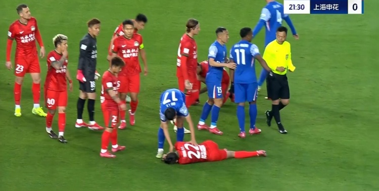 第23分钟,申花左侧角球机会,禁区内卡位时路易斯故意推搡黄锐烽,后者倒地,主裁黄牌警告路易斯↓