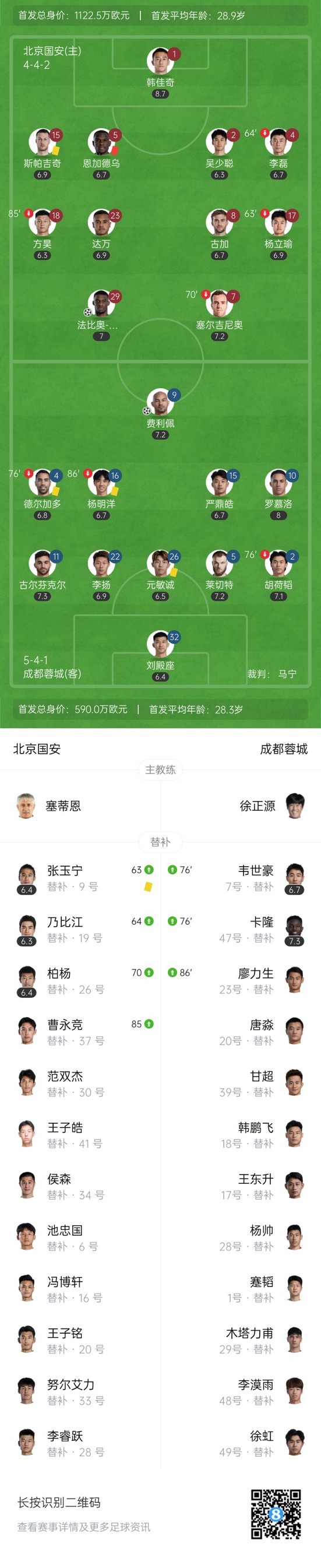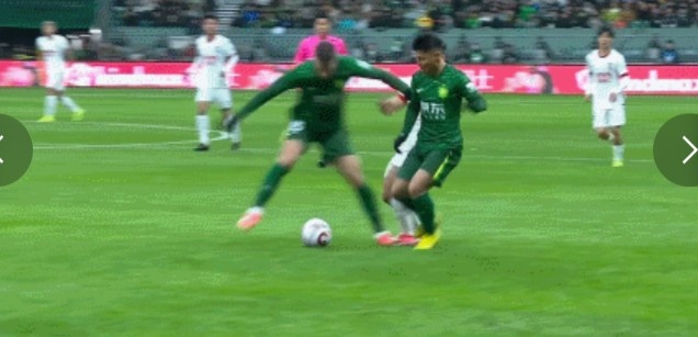 下半场补时7分钟,北京国安1-1成都蓉城。