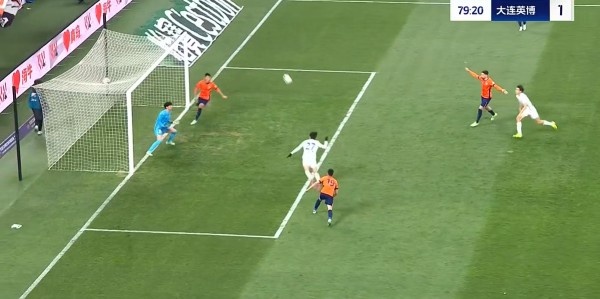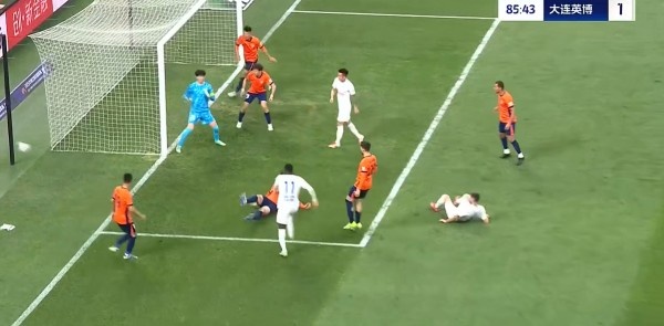 第32分钟,大连英博客场取得领先,拉布亚德左路角球开至后点被解围出禁区,吕焯毅停球之后起脚远射,皮球飞入远角,英博1-0领先青岛海牛。↓