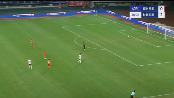 第86分钟,亚泰送出过顶长传,郭全博冲出禁区头球解围,但皮球刚好到徐越脚下,徐越又是直接一脚超远吊射将球打进,长春亚泰3-0梅州客家。↓