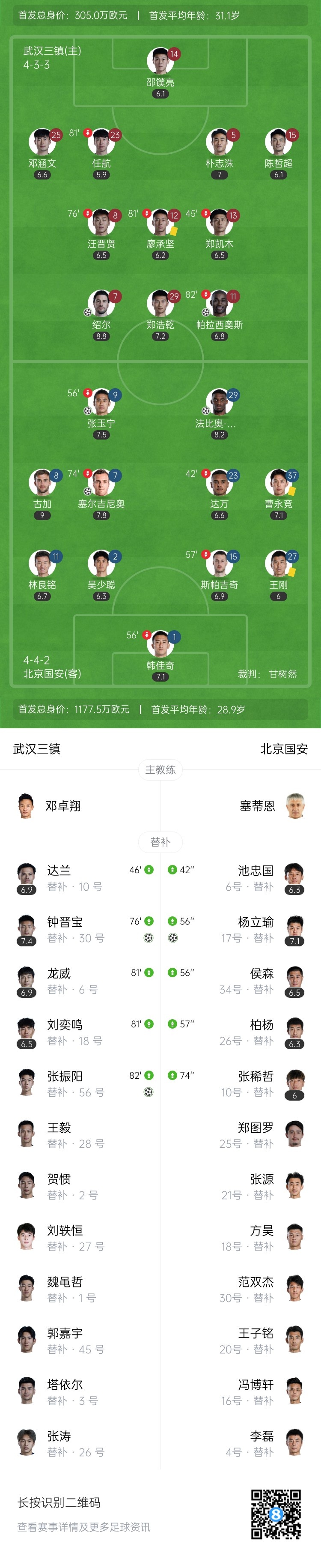 绍尔主罚点球命中,武汉三镇3-4北京国安。↓