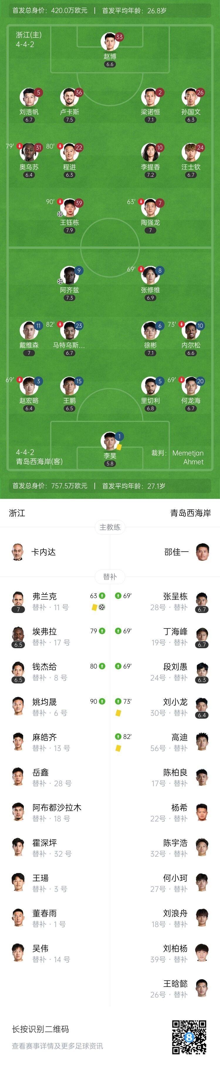 4月27日讯 北京时间4月27日晚上20:00,中超第9轮,浙江坐镇浙江省黄龙体育中心迎战青岛西海岸。上半场,陶强龙中柱,赵博神扑。下半场,王钰栋世界波,卢卡斯造点弗兰克操刀命中,阿齐兹扳回一球。全场结束,浙江2-1青岛西海岸。本场过后,浙江3胜3平3负积12分排名第七,青岛西海岸3胜3平2负积12分暂列第九。
