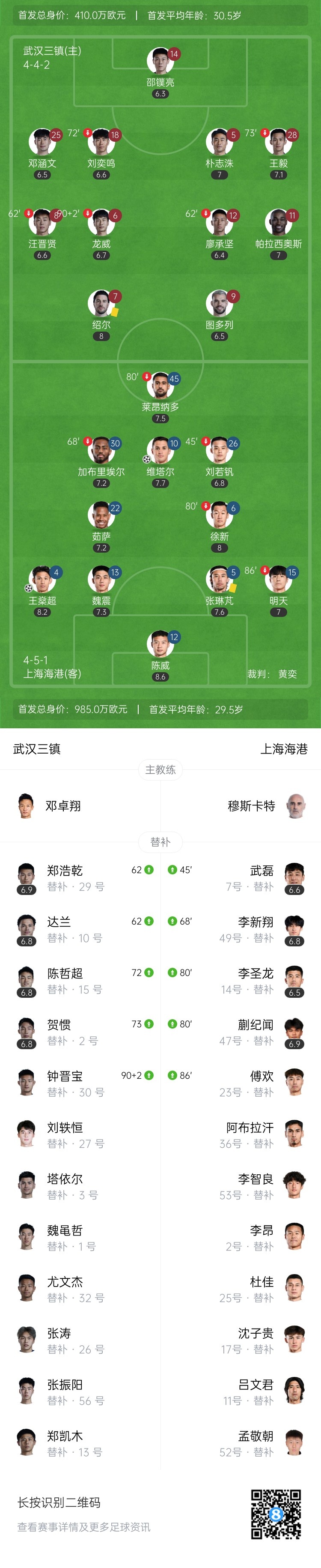 上半场伤停补时1分钟,半场结束,武汉三镇暂0-2上海海港。