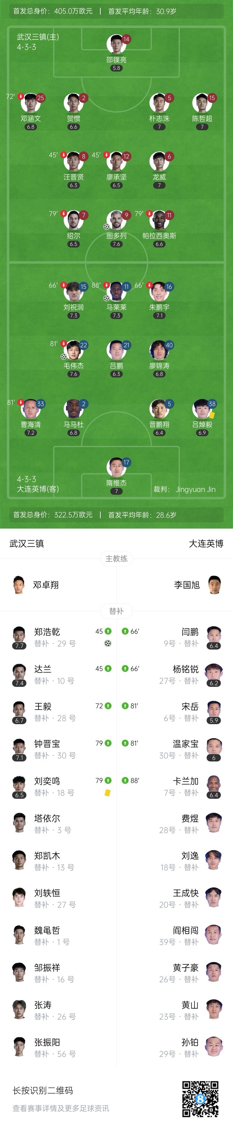 全场比赛结束,武汉三镇主场2-2战平大连英博。