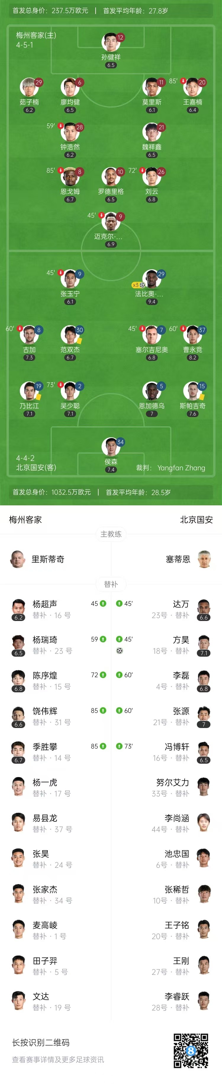 全场比赛结束,梅州客家0-4北京国安。