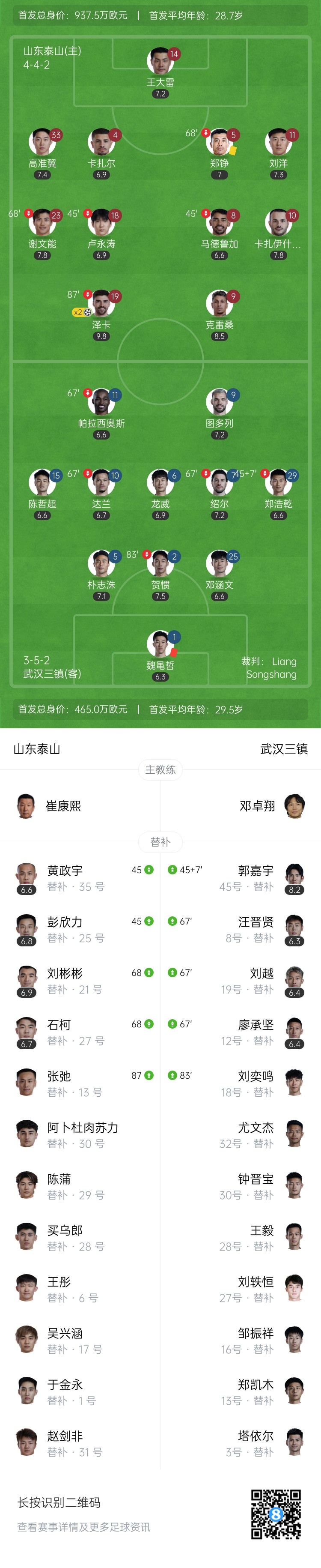 全场比赛结束,最终山东泰山3-1武汉三镇。