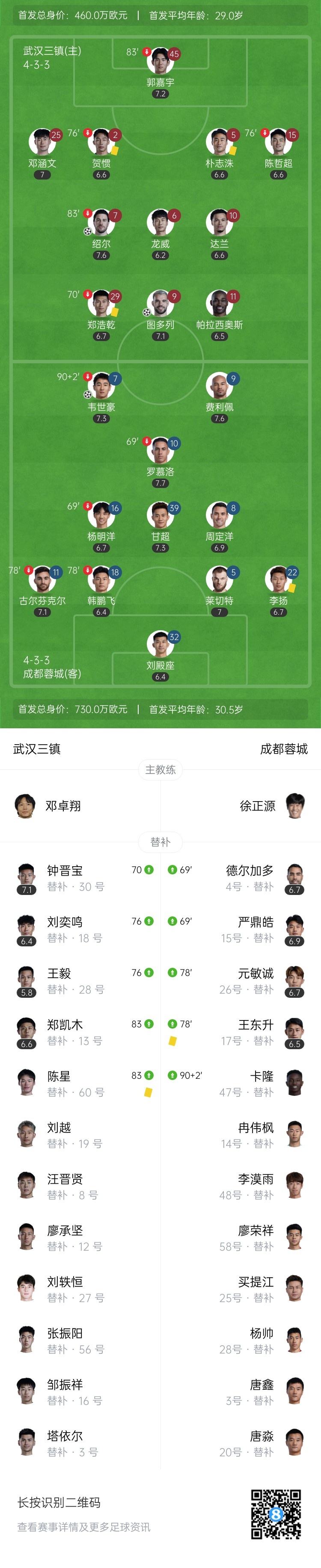 6月29日讯 北京时间19:35,中超第16轮武汉三镇vs成都蓉城,比赛在武汉体育中心体育场打响!上半场,图多列补射建功!半场尾声阶段又自摆乌龙!下半场,绍尔凌空落叶球击中横梁!周定洋错失绝佳机会;绍尔破门帮助三镇再次领先!王毅手球送点,韦世豪点射扳平&近3轮3球2助!最终,武汉三镇2-2战平成都蓉城,蓉城近4轮仅1胜。