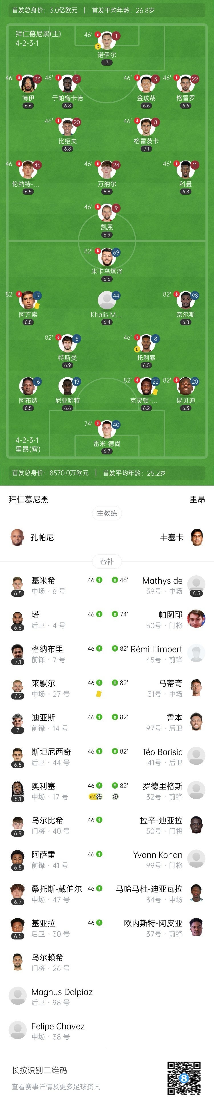全场比赛结束,拜仁慕尼黑主场2-1战胜里昂。