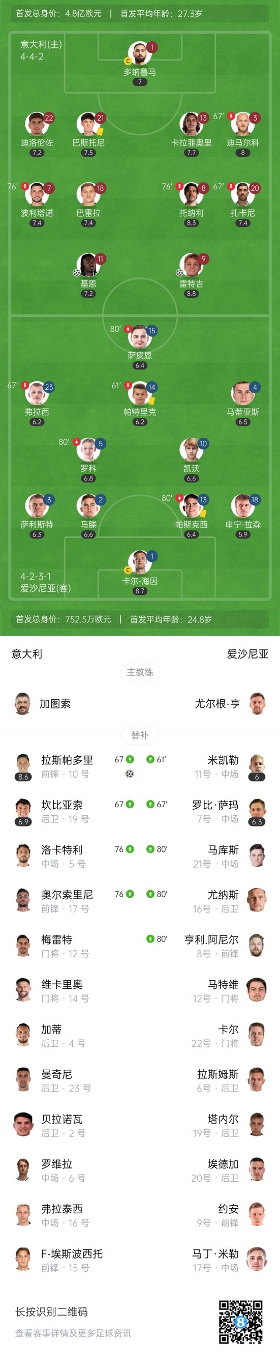 第70分钟,意大利再下一城!波利塔诺右路下底传到门前拉斯帕多里头球破门,意大利3-0爱沙尼亚。↓