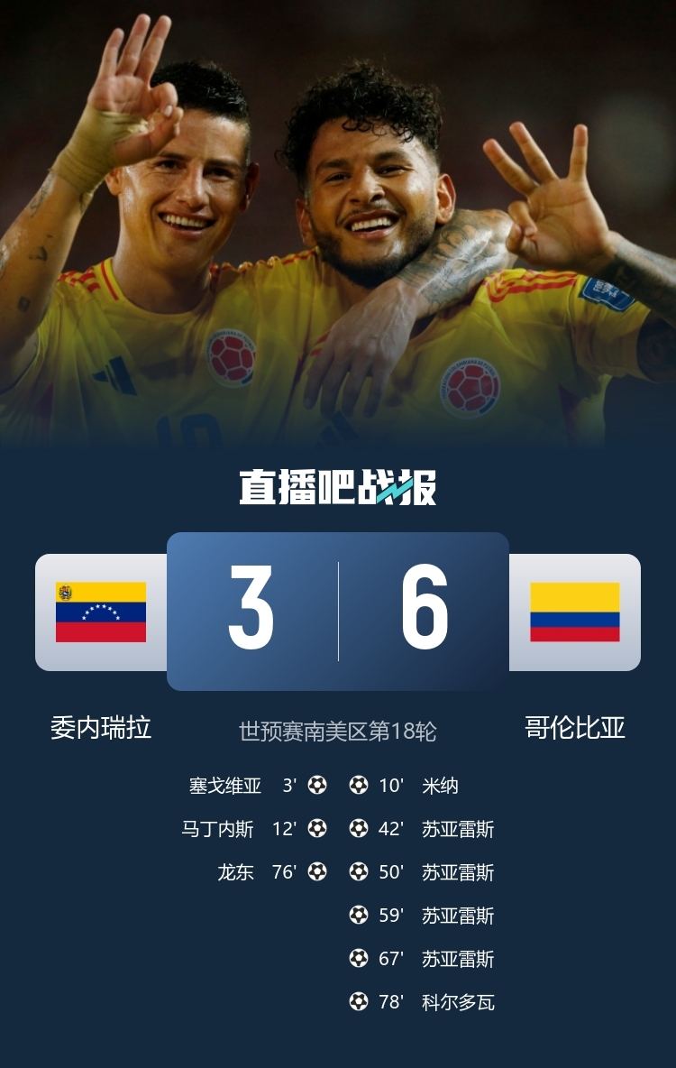 9月10日讯 北京时间9月10日7:30,世预赛南美区第18轮委内瑞拉迎战哥伦比亚的比赛在莫努体育场进行,上半场塞戈维亚抽射破门闪击得手,米纳头球扳平比分,马丁内斯补射建功,迪亚斯助攻苏亚雷斯抽射破门,下半场苏亚雷斯连进三球完成大四喜,龙东补射破门,科尔多瓦替补建功,最终委内瑞拉3-6哥伦比亚居遭逆转居第8无缘附加赛。