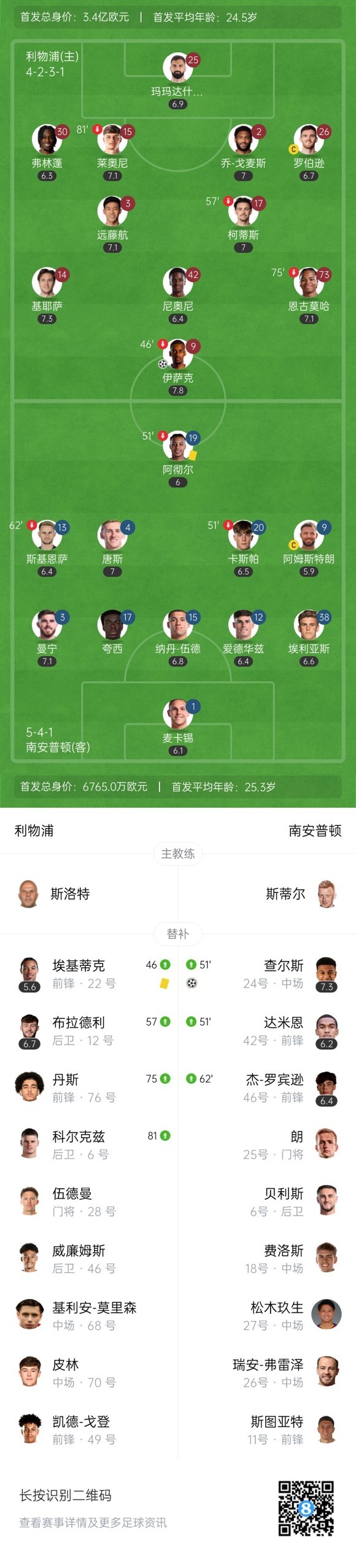 第42分钟,利物浦打破僵局!麦卡锡后场出球失误被断,基耶萨横传门前伊萨克推射破门,利物浦1-0南安普顿。↓