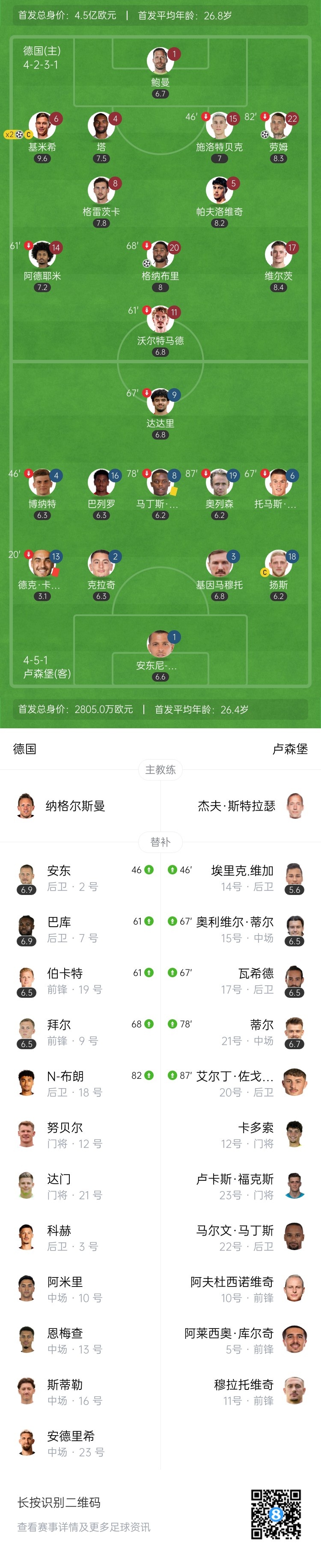 第50分钟,德国队右侧角球机会,禁区内双方争顶后一通乱战,门前基米希觅得机会将球捅进球门,德国队4-0卢森堡。↓
