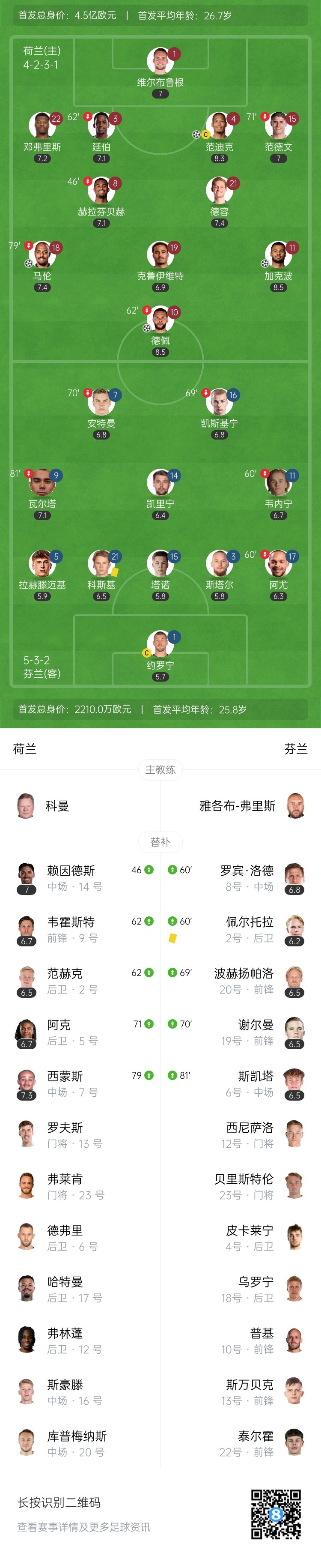 第17分钟,荷兰队前场右路任意球,德佩主罚旋向禁区,小禁区前范迪克鱼跃冲顶破门!荷兰2-0领先芬兰↓