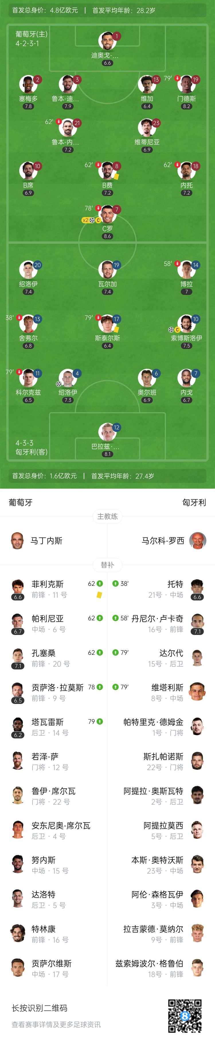 第90+1分钟,匈牙利右路反击,卢卡奇下底传中,皮球一路漏到后点,索博斯洛伊铲射入网绝平!葡萄牙2-2匈牙利↓