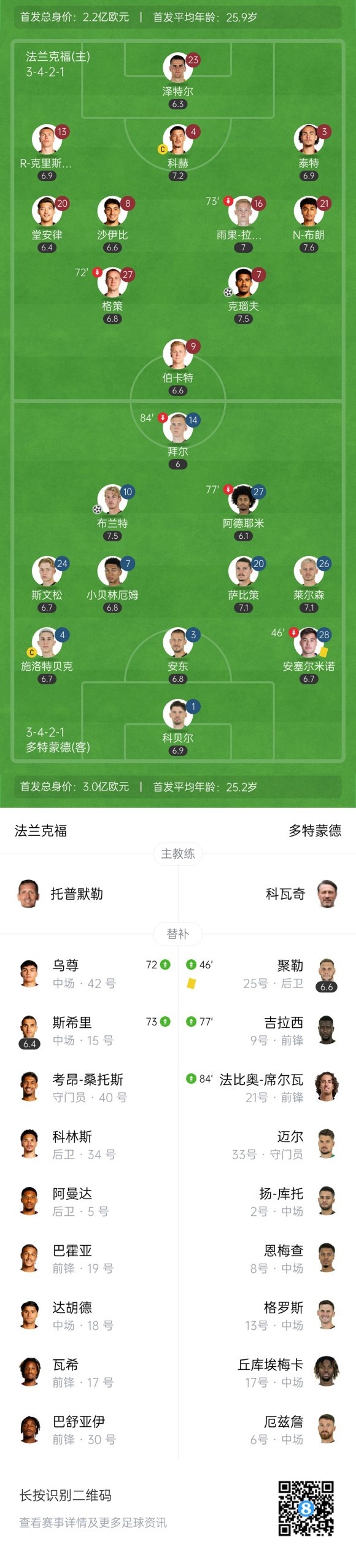 上半场补时3分钟,法兰克福1-0多特。