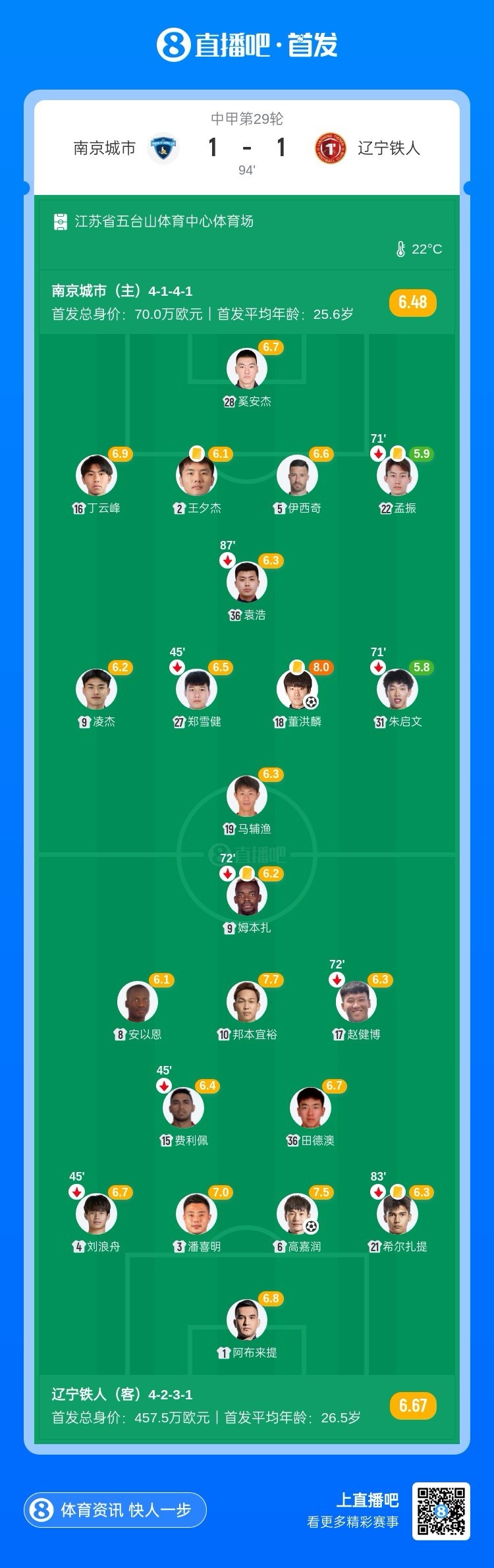11月1日讯 北京时间11月1日下午14时30分,2025赛季中甲第29轮在南京五台山体育场展开角逐,辽宁铁人客场对阵南京城市。上半场马辅渔失良机,下半场邦本宜裕赛季第18次助攻,高嘉润头球打破僵局,门将阿布来提脱手送礼,董洪麟补射扳平。最终辽宁铁人客场1-1战平南京城市,辽宁铁人联赛4连胜遭终结。积分榜方面,辽宁铁人积65分已提前锁定中甲冠军,南京城市积36分位居第10。