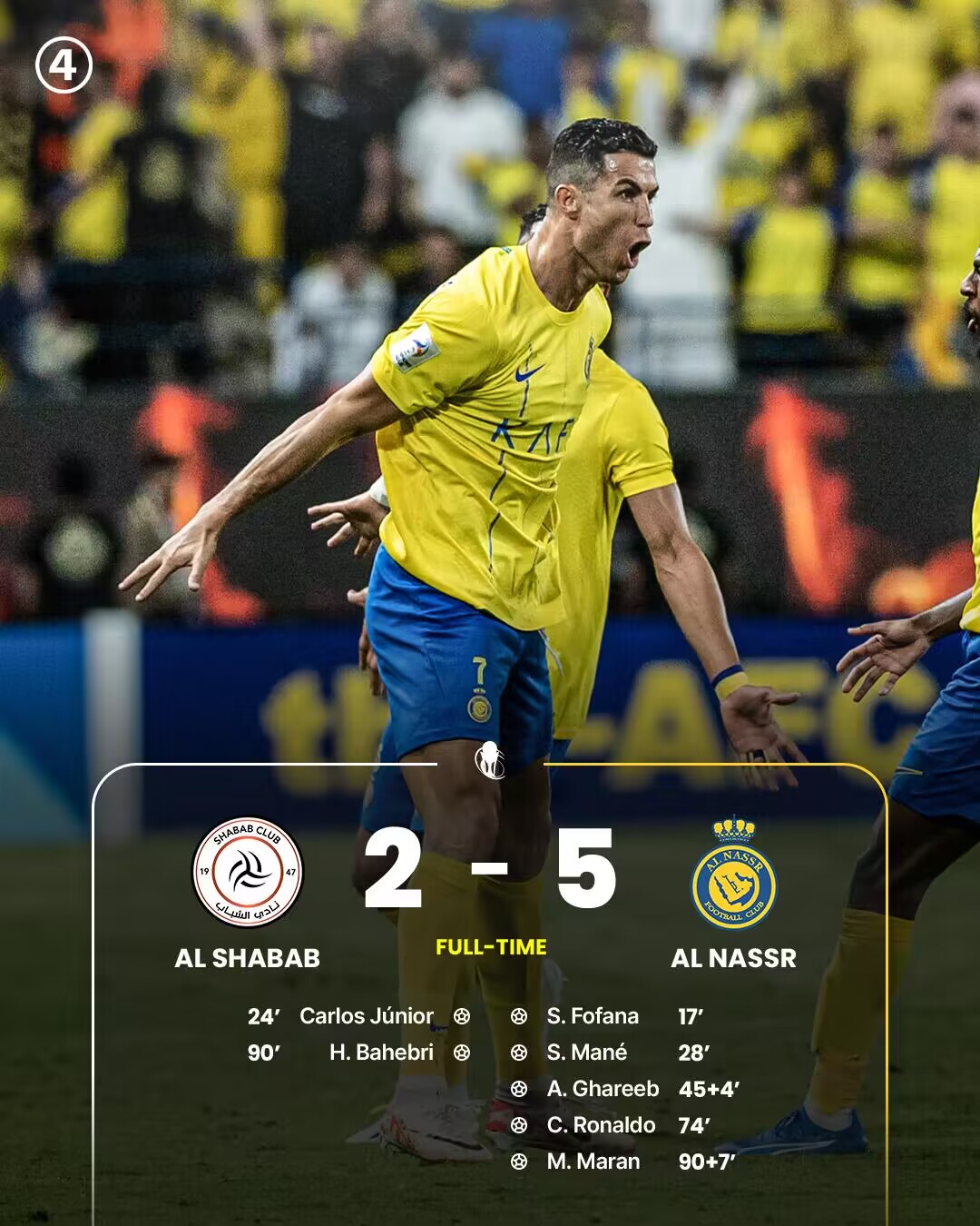 第90分钟,卡拉斯科大力射门被门将扑出,巴赫布里补射为利雅得青年人扳回一球,利雅得胜利4-2领先↓