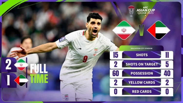 1月24日讯 北京时间1月23日23:00,亚洲杯C组第3轮,伊朗对阵阿联酋。上半场比赛,阿兹蒙助攻塔雷米破门。下半场比赛,伊朗门将扑出点球,阿兹蒙再次助攻塔雷米破门,最后时刻阿尔哈萨尼兜射追回一球。全场比赛结束,伊朗2-1战胜阿联酋。小组赛结束,伊朗三连胜小组第一,淘汰赛将对B组小组第三叙利亚,阿联酋4分凭借净胜球优势小组第2,淘汰赛将对阵塔吉克斯坦。