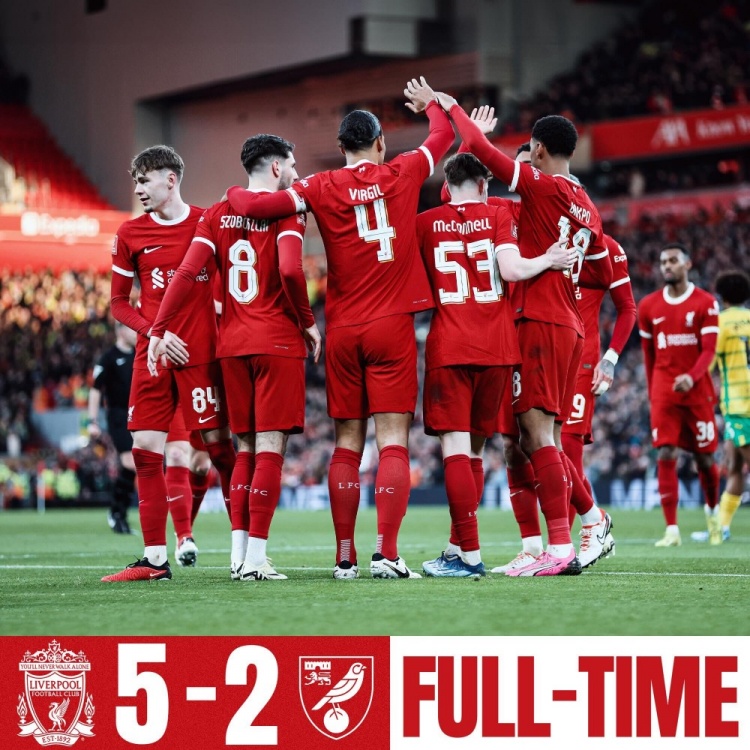 1月29日讯 北京时间22点30分,足总杯第4轮,利物浦vs诺维奇。上半场,首次首发的小将麦康奈尔助攻琼斯破门,吉布森后背破门迅速扳平,努涅斯单刀破门;下半场若塔&范迪克再下两城,塞恩斯进球被吹后轰出世界波!赫拉芬贝赫补时再进一球。最终,利物浦5-2战胜诺维奇,晋级足总杯16强,1/8决赛的对手将是沃特福德vs南安普顿的胜者。