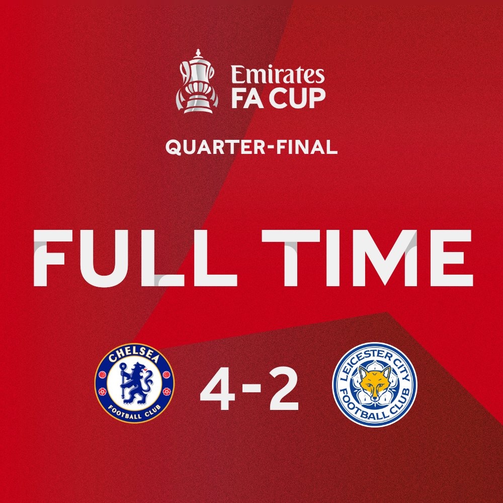 下半场补时8分钟,切尔西4-2莱斯特城。