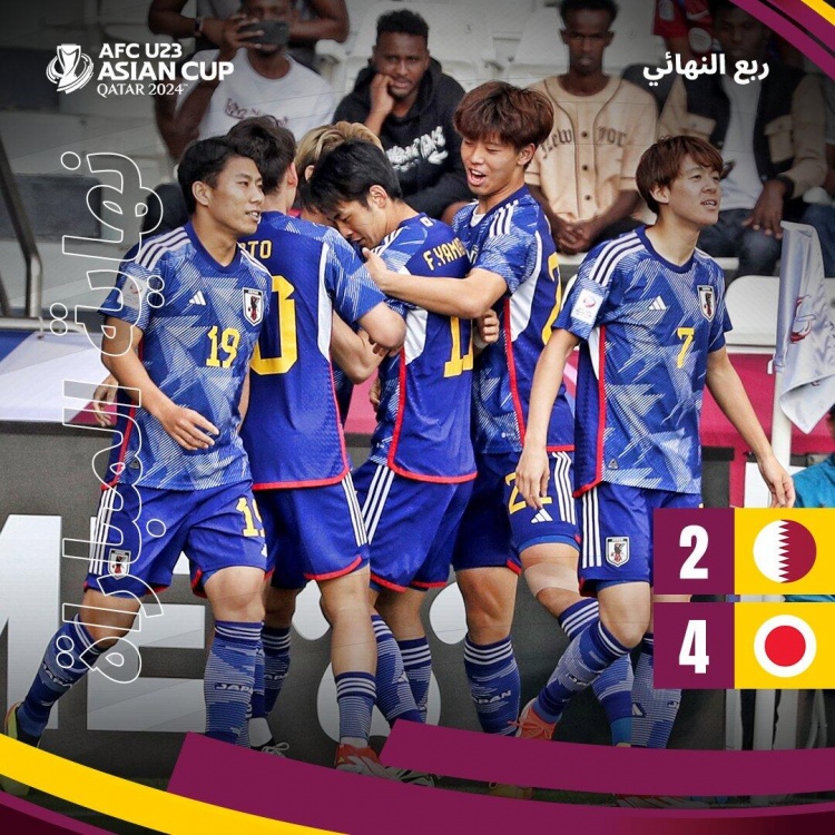4月26日讯北京时间4月25日22时,U23亚洲杯1/4决赛,日本U23对阵卡塔尔U23。上半场,山田枫喜世界波破门为日本队取得领先,拉维头球破门扳平比分,细谷真大错失空门良机,卡塔尔门将巴利德犯规被直红罚下!半场战罢,日本暂1-1卡塔尔;下半场,阿卜杜勒萨拉姆破门将比分反超,木村诚二进球扳平比分。常规时间内双方战成2-2,进入加时赛。加时赛上半场,细谷真大破门将比分超出;加时赛下半场,內野航太郎补射破门扩大比分优势。全场比赛结束,日本4-2卡塔尔晋级半决赛!