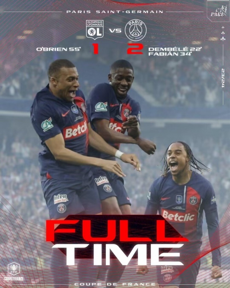 5月26日讯 法国杯决赛,巴黎圣日耳曼对阵里昂。上半场,登贝莱建功,法比安破门。易边再战,杰克-奥布莱恩头槌扳回一城。最终巴黎2-1里昂夺得队史第15冠。