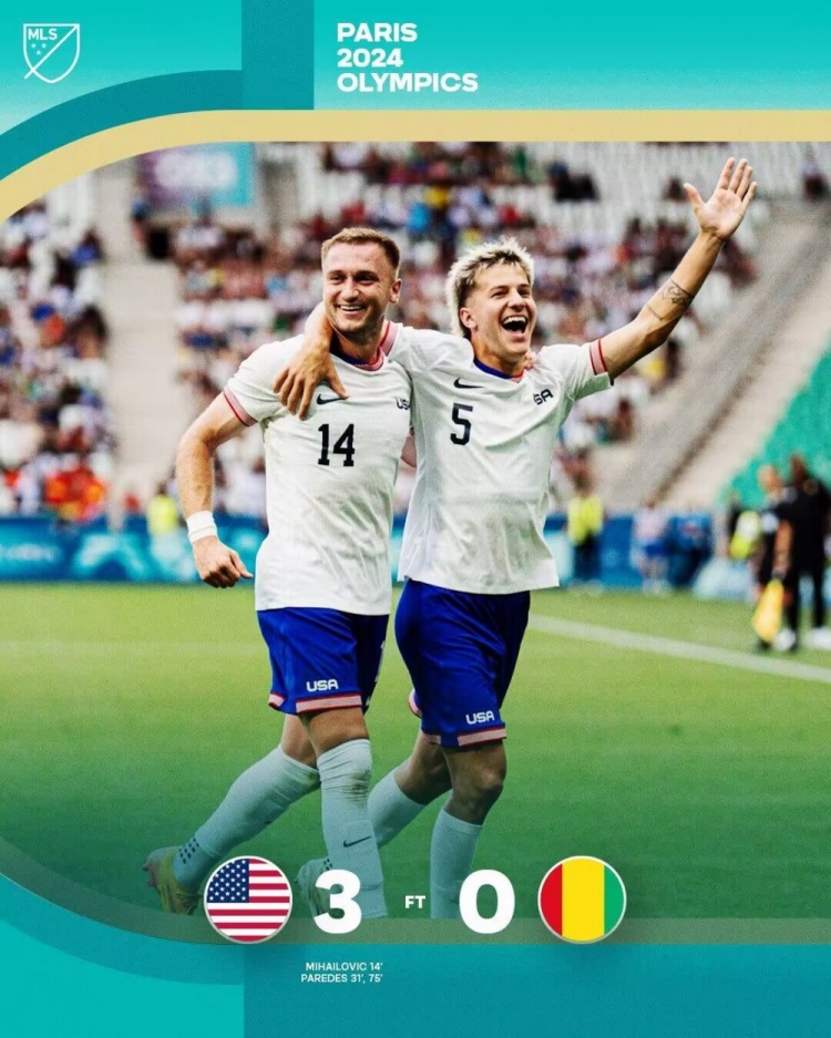 7月31日讯 奥运男足A组第3轮,美国国奥3-0完胜几内亚,凯文-帕雷德斯双响。美国也得以作为A组第二晋级淘汰赛。