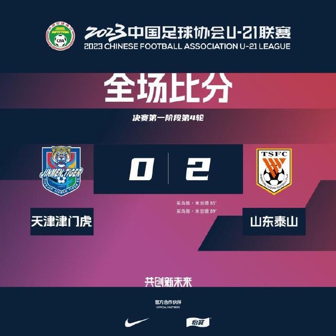6月3日讯 2023中国足球协会U-21联赛决赛第一阶段第4轮,天津津门虎U21 0-2 山东泰山U21,买乌郎梅开二度。