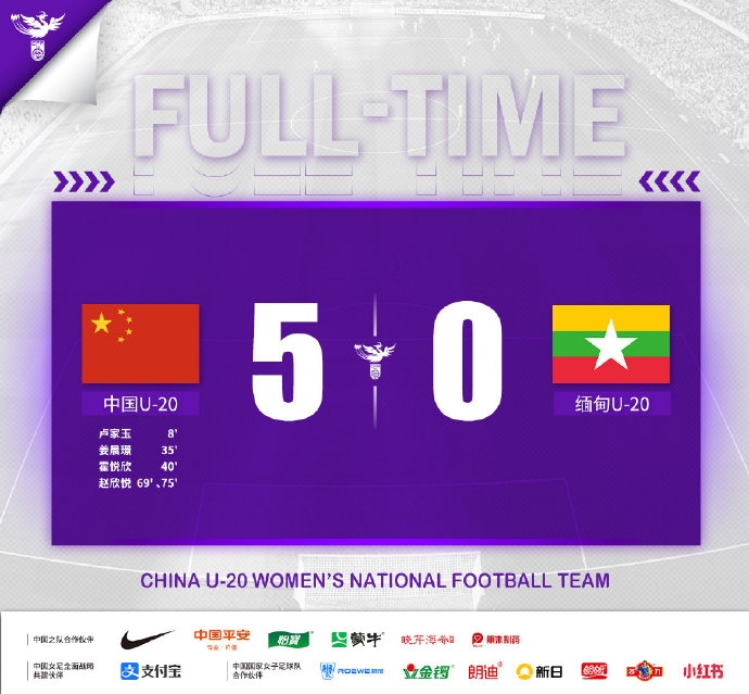 伤停补时4分钟。全场结束,中国U20女足5-0缅甸U20女足。