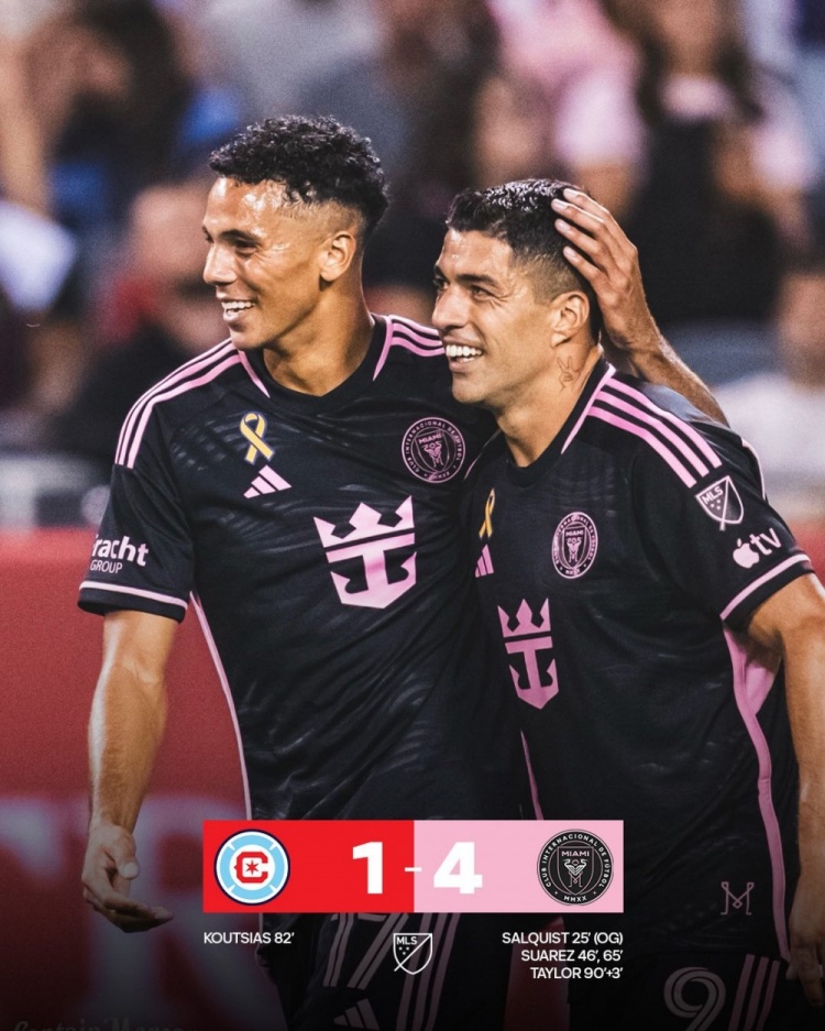 9月1日讯 北京时间9月1日上午8:30,美职联第29轮,迈阿密国际客场挑战芝加哥火焰。上半场,苏亚雷斯造乌龙后头球中框。下半场,苏亚雷斯开场1分钟闪击,随后他梅开二度,库特西亚斯扳回一球,泰勒再下一城。全场结束, 迈阿密国际4-1芝加哥火焰。本场过后,迈阿密国际迎来联赛四连胜,目前他们积56分排名东区榜首,芝加哥火焰积26分排名东区倒数第二。
