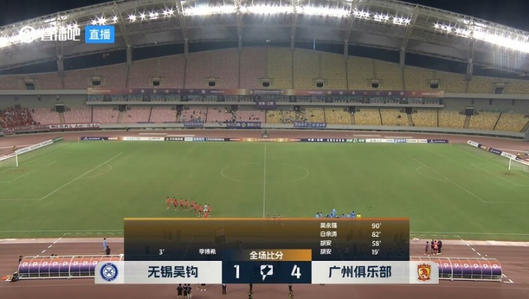 全场比赛结束,广州队客场4-1逆转无锡吴钩。