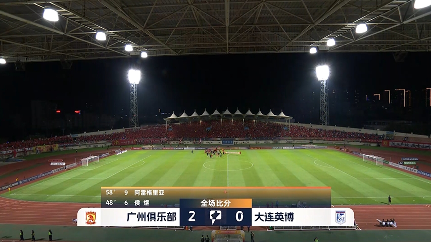 全场比赛结束,广州队主场2-0击败大连英博。
