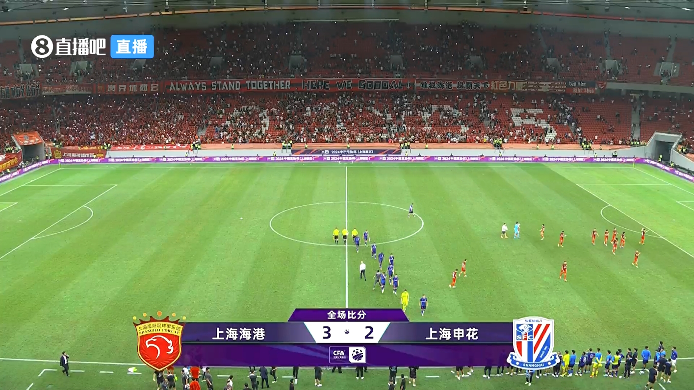 伤停补时8分钟。全场比赛结束,上海海港3-2上海申花。