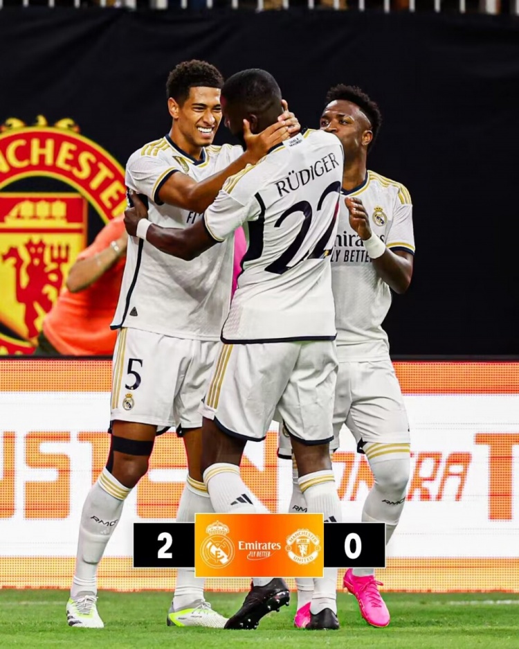 7月27日讯 北京时间今天早上8:30,皇马与曼联友谊赛。奥纳纳上演曼联首秀。上半场贝林厄姆打进皇马生涯处子球,梅努伤退。易边再战双方先后大面积更换球员,何塞卢打进石破天惊的倒钩进球,收获回归首球。最终皇马2-0曼联收获热身赛两连胜。