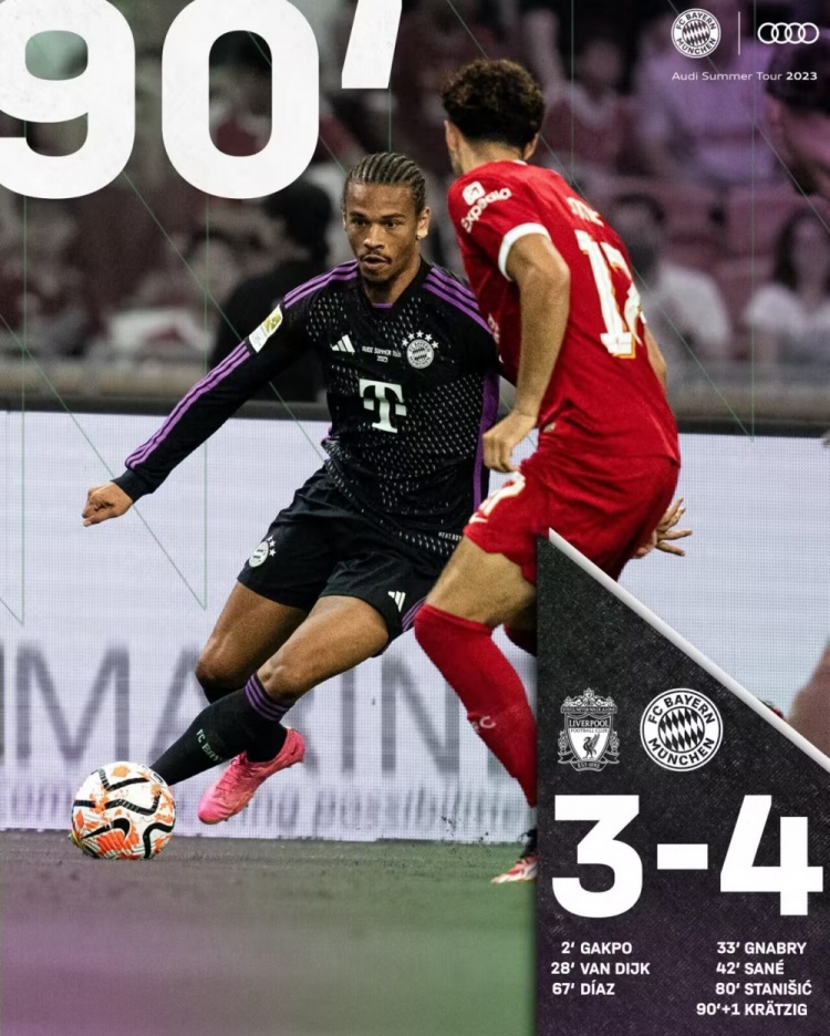 8月2日讯 19点30,友谊赛利物浦对阵拜仁。上半场若塔助攻加克波2分钟闪击破门上演1V3个人秀,新任红军队长范迪克头槌破门,帕瓦尔头球中柱,金玟哉精彩长传助攻格纳布里破门,随后格纳布里助攻萨内扳平比分。易边再战双方先后大面积更换球员,萨拉赫助攻迪亚斯再次超出比分,斯坦尼西奇补射帮助拜仁再次扳平,补时阶段克雷茨格世界波绝杀。最终拜仁4-3逆转利物浦。