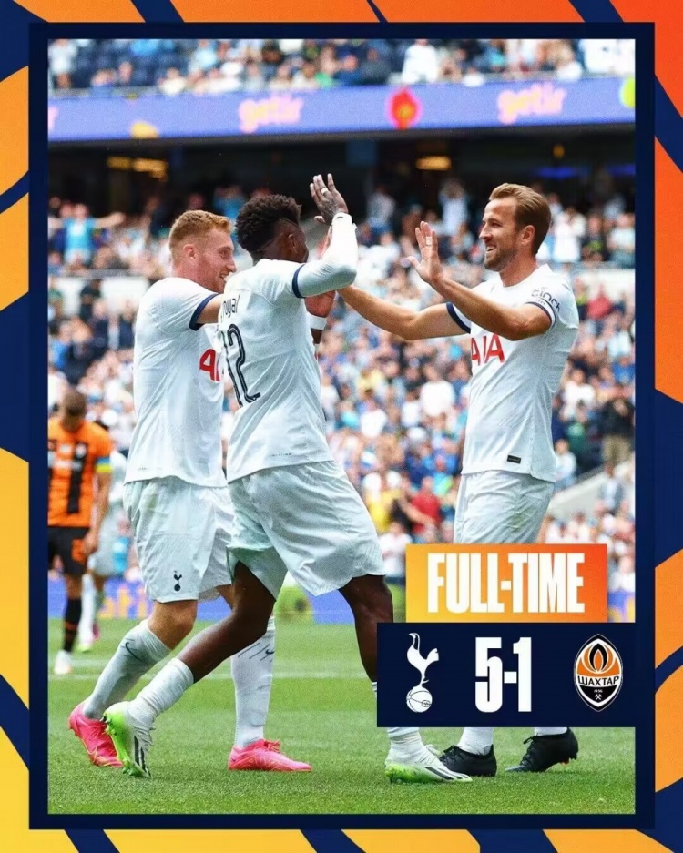 8月6日讯 北京时间8月6日21点,友谊赛托特纳姆热刺对阵顿涅茨克矿工。上半场,热刺攻势占优数次威胁球门,麦迪逊造点,凯恩点射破门,凯文头球扳平比分。下半场,凯恩头顶脚踢再入三球,丹恩压哨破门。全场比赛结束,托特纳姆热刺5-1顿涅茨克矿工。