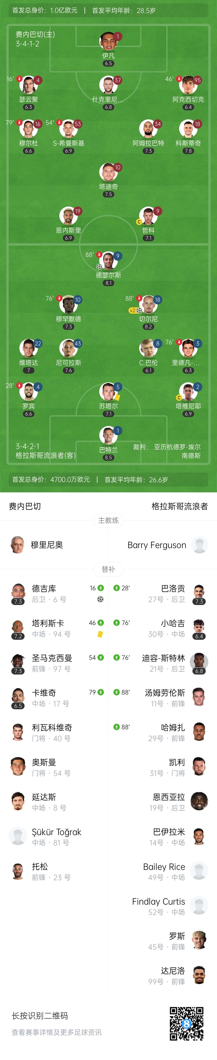 3月7日讯 北京时间1:45,欧联杯1/8决赛首回合费内巴切主场迎战格拉斯哥流浪者,比赛在萨拉克格鲁球场打响!上半场,德瑟尔斯率先破门,德吉库扳平比分;德瑟尔斯助攻切尔尼将比分再次超出!下半场,德瑟尔斯又打进2球,但是都被吹越位无效!切尔尼破门完成双响!最终,费内巴切主场1-3不敌格拉斯哥流浪者,各项赛事18场不败遭终结!双方次回合将在流浪者主场进行。