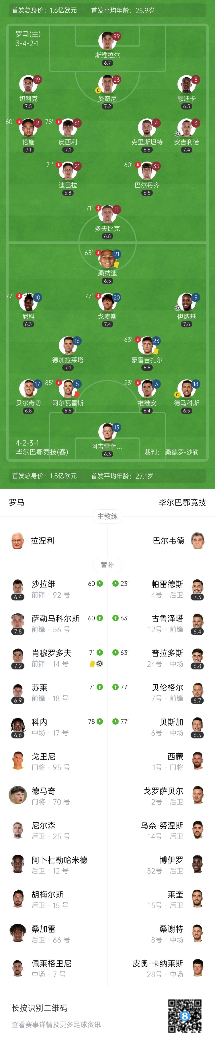 3月7日讯 北京时间4:00,欧联杯1/8决赛首回合,罗马主场迎战毕尔巴鄂竞技,比赛在罗马奥林匹克球场打响!上半场,迪巴拉中横梁,双方均无建树。下半场,伊纳基-威廉姆斯打破僵局,安吉利诺扳平比分;尾声阶段,耶雷-阿尔瓦雷斯染红。补时3分钟的最后1秒!肖穆罗多夫禁区内转身破门绝杀!罗马2-1毕尔巴鄂竞技,各项赛事5连胜!双方次回合将移师毕尔巴鄂竞技主场进行。