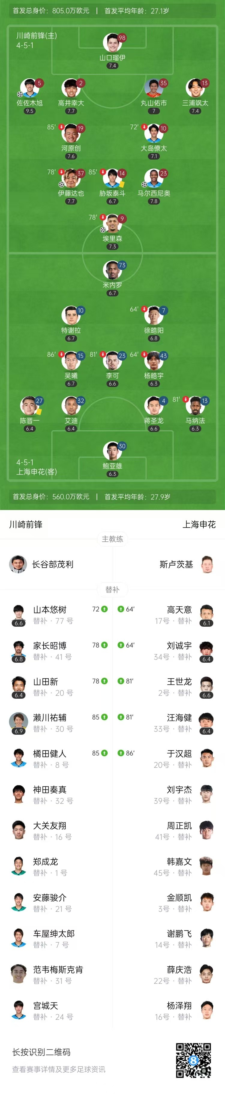 第64分钟,佐佐木旭前场右侧送出传中,埃里松中路插上推射破门,VAR介入后确认进球有效,川崎前锋2-0上海申花。↓